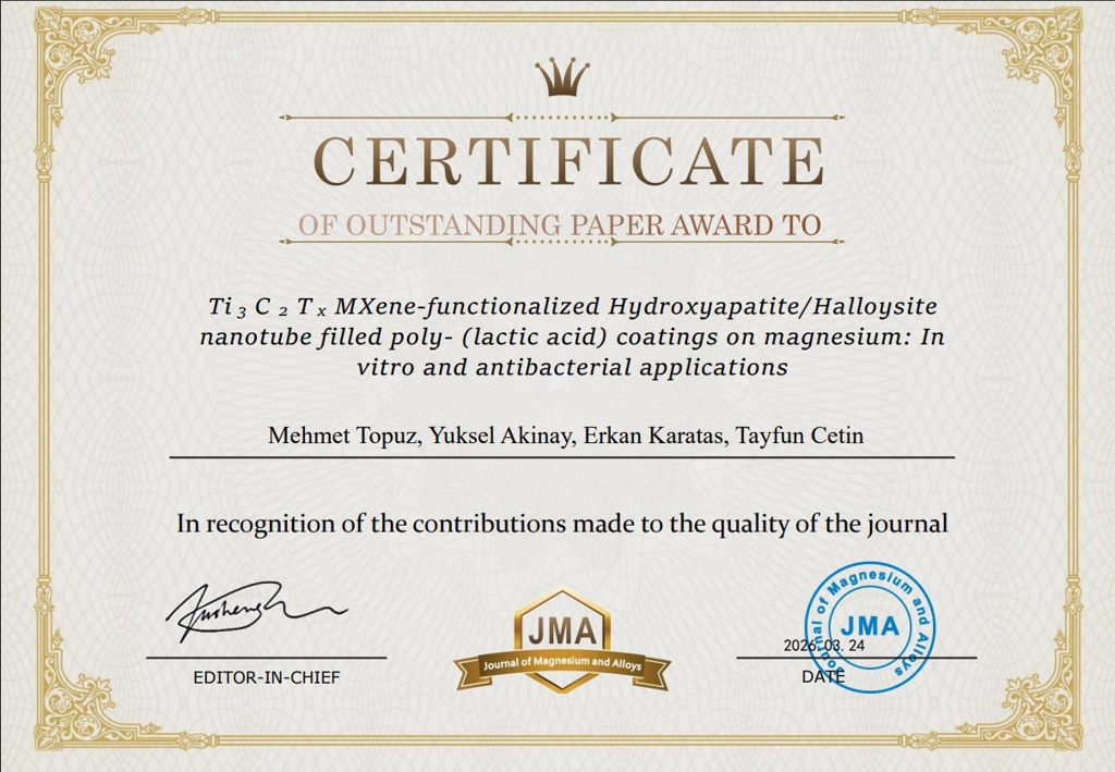 24 Mart 2026 tarihinde takdim edilen ödül, Dr. Öğr. Üyesi Çetin’in magnezyum üzerine uygulanan fonksiyonelleştirilmiş kaplamaların antibakteriyel etkilerini incelediği bilimsel çalışmasının dergiye sağladığı katkılar nedeniyle verildi.