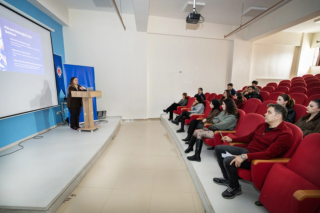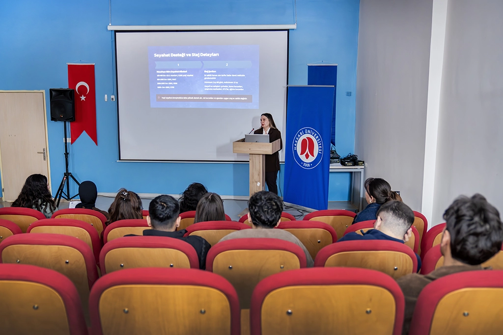 Üniversitemiz Erasmus+ Kurum Koordinatörü Dr. Öğr. Üyesi Büşra Tuğçe Susam tarafından gerçekleştirilen sunumda, Erasmus+ programının öğrencilere sunduğu akademik, kültürel ve kişisel gelişim fırsatları hakkında detaylı bilgiler verildi. Program kapsamında öğrencilerin yurtdışında eğitim alma ve staj yapma imkânı elde ederek uluslararası deneyim kazanmalarının önemine de değinildi.