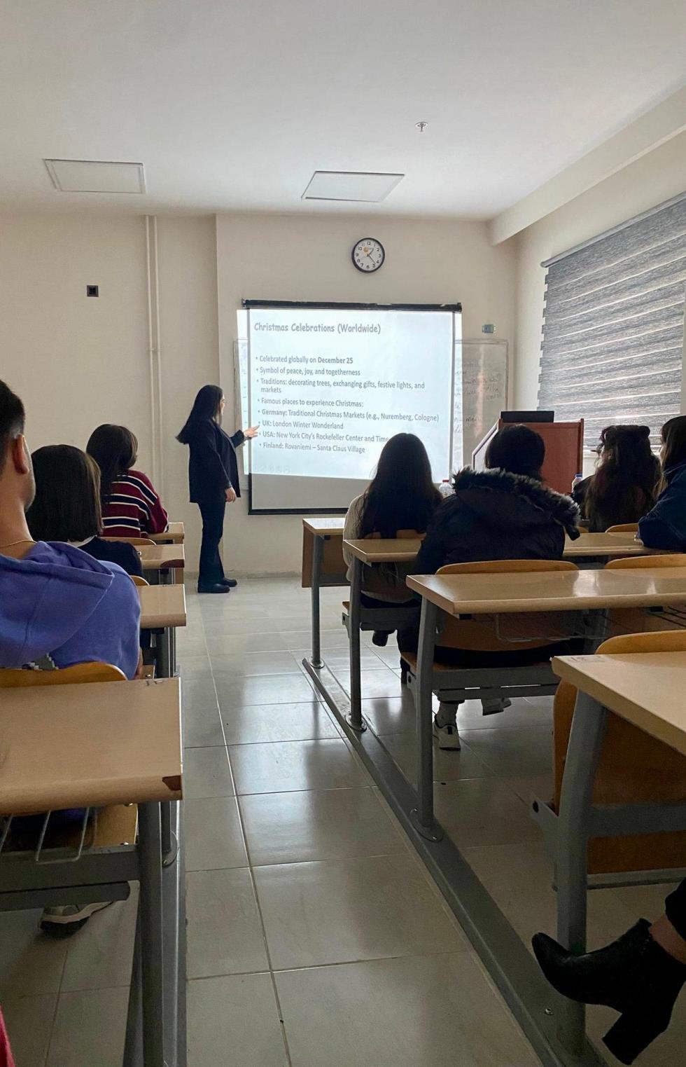 Yabancı Diller Yüksekokulu, Zorunlu Hazırlık sınıfında Aralık ayı etkinliğimiz Öğr.Gör. Ümran Roda SUVAĞCI ve Öğr.Gör. Elif Beyza TÜRKMENOĞLU tarafından gerçekleştirildi. “Winter Festivals Around the World and in Turkey” başlıklı sunum eşliğinde gerçekleştirildi.Etkinlik, öğrencilerin sözlü iletişim becerilerini geliştirmelerine, eleştirel düşünme ve tartışma becerilerini pekiştirmelerine katkı sağladı.Etkinlik, hem öğretim görevlilerimiz hem de öğrencilerimiz için pedagojik açıdan zengin, keyifli ve farklı bir deneyim oldu.